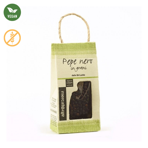 Il pepe bianco deriva dal solo seme del frutto e si ottiene tenendo a bagno per circa una settimana il frutto del pepe, in questo modo la polpa si decompone e può facilmente essere eliminata. Rimossa la parte esterna, il seme viene essiccato. Le confezioni sono realizzate artigianalmente in carta fatta a mano a partire da fibre naturali.